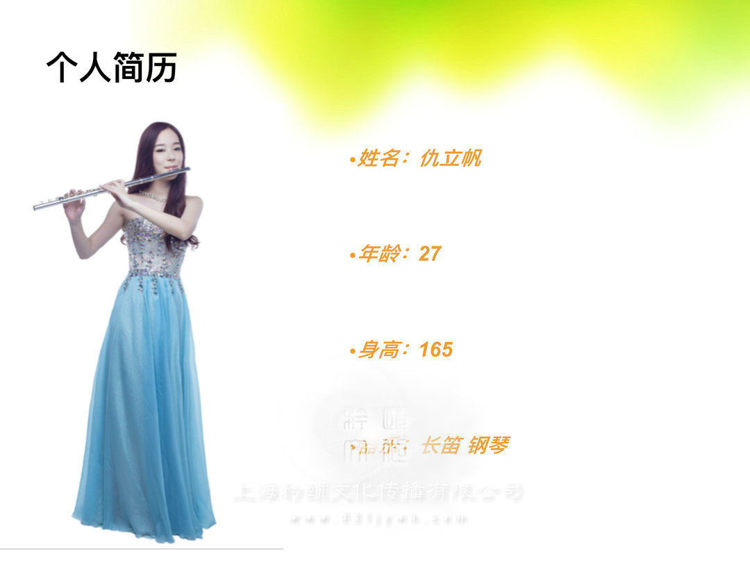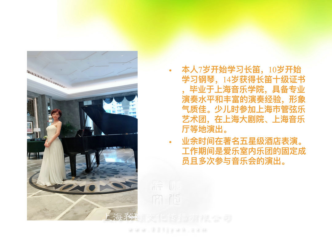 本人7歲開始學習長笛,10歲開始學習鋼琴,14歲獲得長笛十級證書,畢業于上海音樂學院,具備專業演奏水平和豐富的演奏經驗,形象氣質佳。少丿L時參加上海市管弦樂藝術團,在上海大劇院、上海音樂廳等地演出。業余時間在著名五星級酒店表演。工作期間是愛樂室內樂團的固定成員且多次參與音樂會的演出。