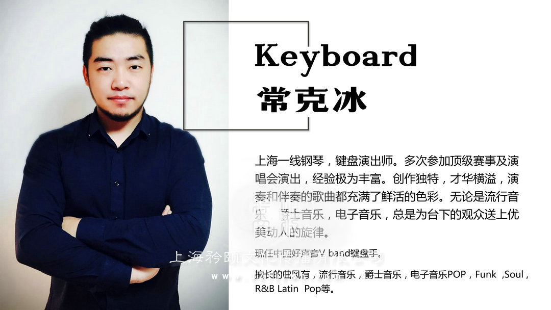 Keyboard上海一線鋼琴,鍵盤演出師。多次參加頂級賽事及演唱會演出,經驗極為豐富。創作獨特,才華橫溢,演奏和伴奏的歌曲都充滿了鮮活的色彩。無論是流行音樂,爵士音樂,電子音樂,總是為臺下的觀眾送上優美動人的旋律。
