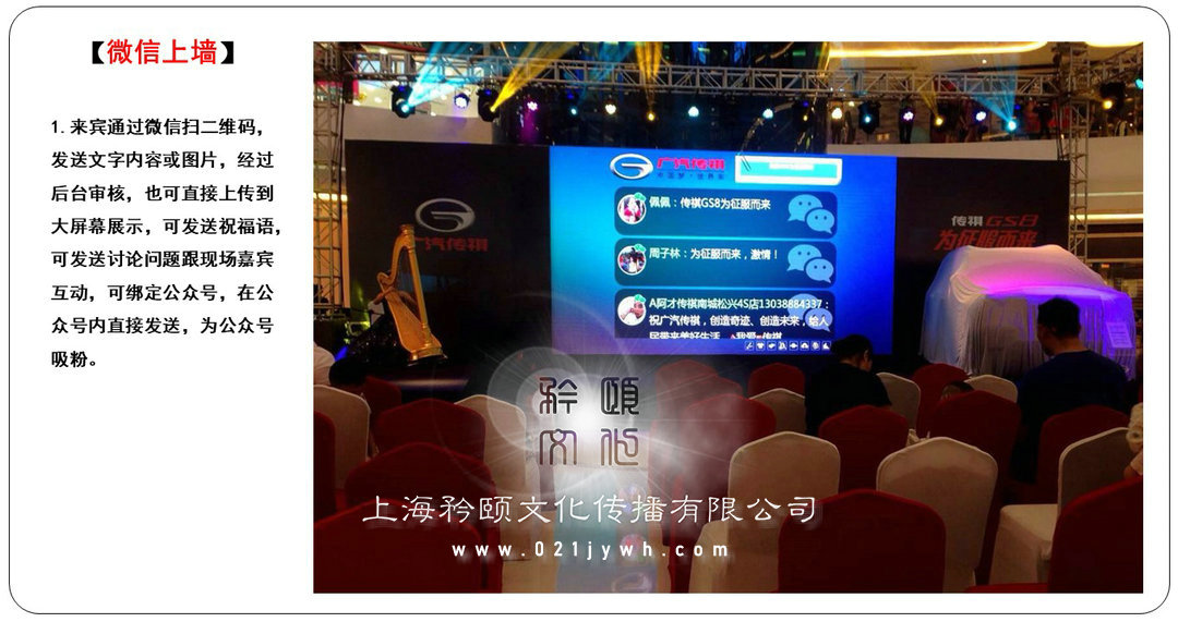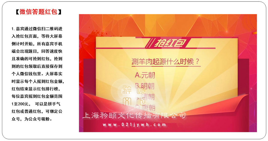 1.嘉賓通過微信掃二維碼進(jìn)入鏈接看到紅包,等待大屏幕倒計(jì)時(shí)開始,所有嘉賓迅速點(diǎn)開紅包,速度快的搶到紅包,搶到的紅包領(lǐng)取后直接保存到個(gè)人微信錢包里。大屏幕實(shí)時(shí)顯示每個(gè)人搶到紅包金額,紅包結(jié)束顯示紅包排行榜,每位嘉賓搶到紅包金額范圍1至200元, 可以是拼手氣紅包或普通紅包,可綁定公眾號(hào),為公眾號(hào)吸粉。1.嘉賓通過微信掃二維碼進(jìn)入搶紅包頁面,等待大屏幕倒計(jì)時(shí)開始,所有嘉賓手機(jī)端會(huì)出現(xiàn)題目,回答速度快且準(zhǔn)確的可搶到紅包,搶到到的紅包領(lǐng)取后直接保存到個(gè)人微信錢包里。大屏幕實(shí)時(shí)顯示每個(gè)人搖到紅包金額,紅包結(jié)束顯示紅包排行榜,上海活動(dòng)公司搖到紅包金額范圍1至200元, 可以是拼手氣紅包或普通紅包,可綁定公眾號(hào),為公眾號(hào)吸粉。
